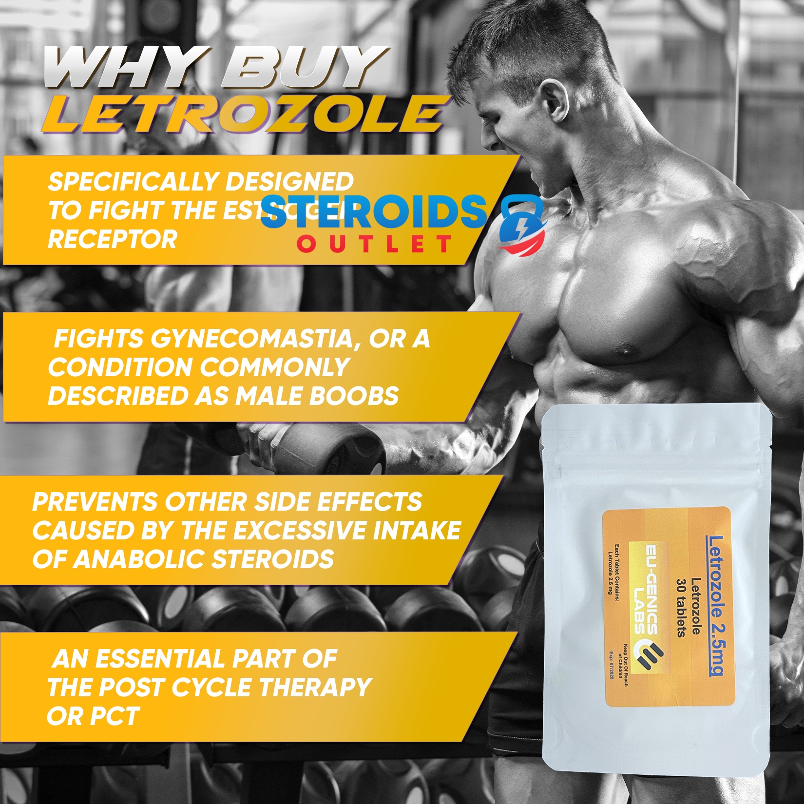 É um inibidor da Aromatase que bloqueia a enzima aromatase, responsável pela produção de estrogênio. Além disso, isso reduz os níveis séricos totais de estrogênio no corpo, inibindo a função do estrogênio. É muito benéfico para usuários de esteróides anabolizantes. Além disso, o excesso de estrogênio geralmente leva ao aumento dos efeitos colaterais mais comumente associados ao uso de esteróides anabolizantes.